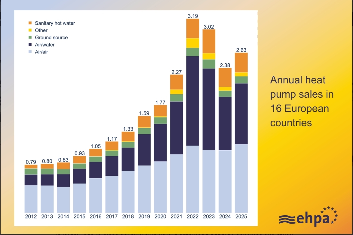 Selon les données préliminaires de l' Association européenne des pompes à chaleur , les ventes de pompes à chaleur dans 16 pays européens ont augmenté en moyenne de 11 % en 2025. Au total, environ 2,63 millions d'unités ont été vendues, contre 2,38 millions en 2024, ce qui porte la base installée totale à environ 28 millions d'unités.